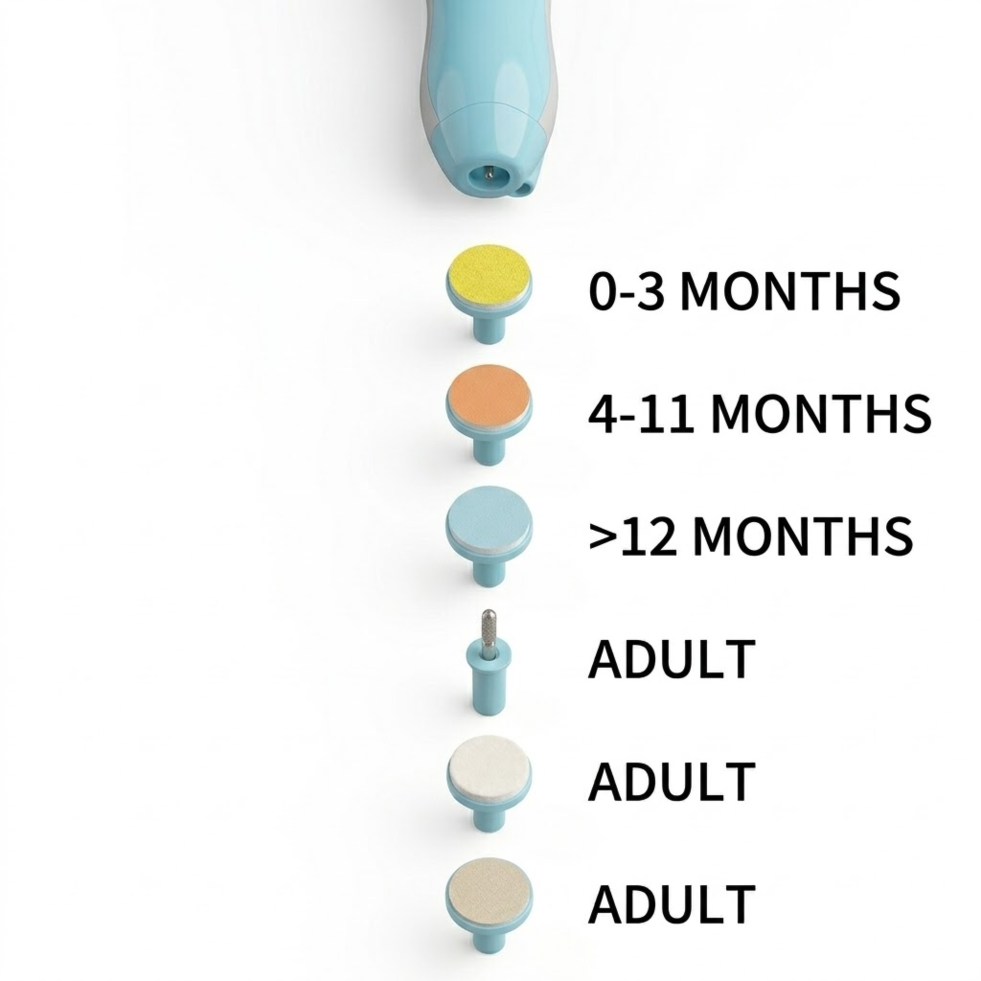 Get your little one cozy and choose the right filing pad for their age using our handy color guide. Just pop it onto the trimmer, and you are ready for a safe, tear-free manicure in total comfort. 👶✨